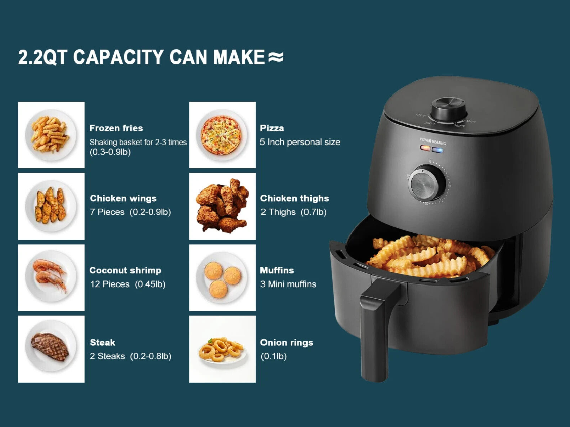 2.2 Quart Air Fryer, Compact Air Fryer for Healthy Cooking, Nonstick coated pan& tray, User Friendly and Adjustable Temperature Control with Timer & Auto Shutoff. Fast & Easy comfort food, Dishwasher Safe Basket, You can make a variety of food; The 2.2-Quart fryer basket and tray are removable and top rack dishwasher safe. Basket is nonstick coating and easy to clean, The Oil-Free Air Fryer`s unique vapor system combined with circulating hot air , it will automatically make foods crispier and healthier without oil. The personal and compact size air fryer saves space on your counter. Perfect for any small kitchen, dorm room, and more! Reheat your leftover fried foods to become exactly as they were when first fried. Achieve perfect fried results with little or even no oil! Temperature range from 175°F to 400°F allows cooking at your desired temperature, achieving a healthy, crispy, and fried finish using at least 98% less oil than traditional fryers.
