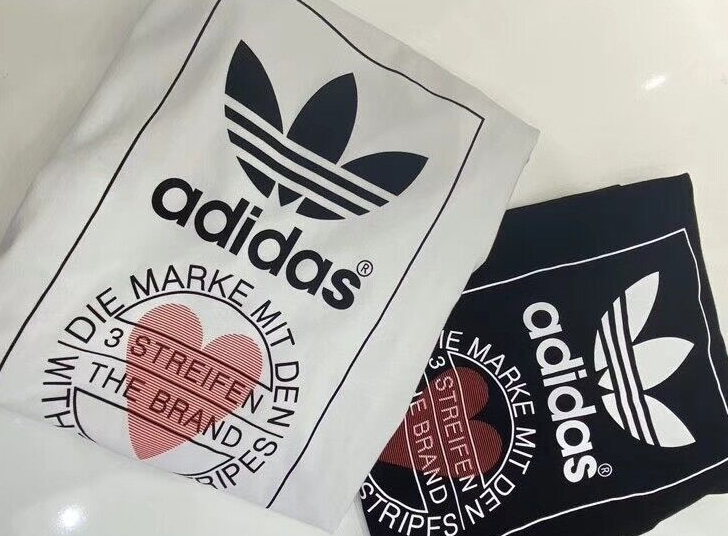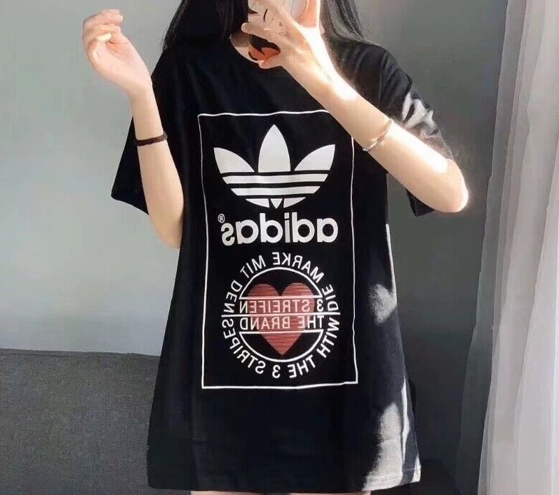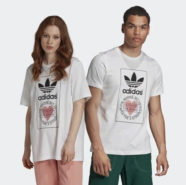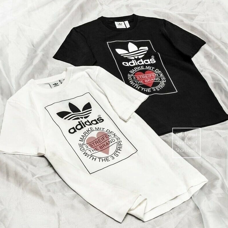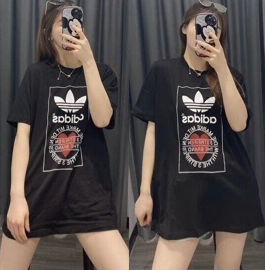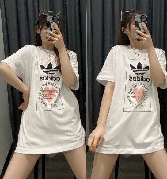 Made from 100% cotton featuring a ribbed neckline, short sleeves and unique heart print added onto Adidas's originals classic logo. This unisex shirt is oversized in fitting and long in length for women, regular fit for men.It is perfect for active wear, or for a casual look.