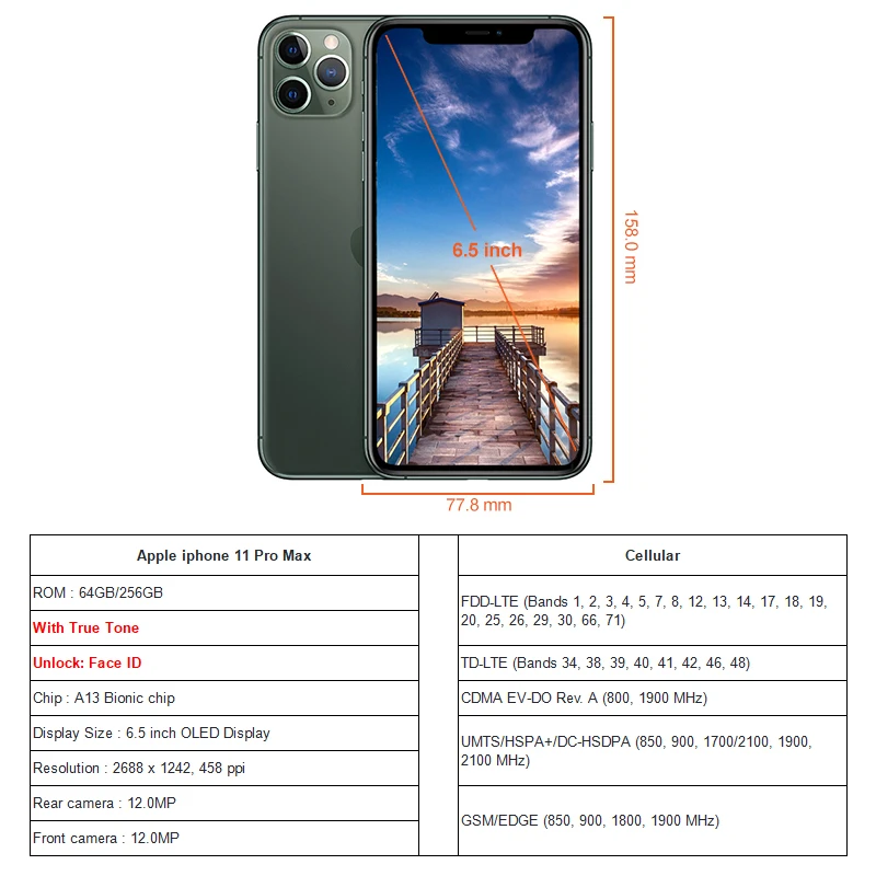 Apple iphone 11 pro max 64GB/256GB ROM Unlocked Smartphone With Face ID A13 Bionic chip 6.5 inch OLED Screen 12MP Camera NFC