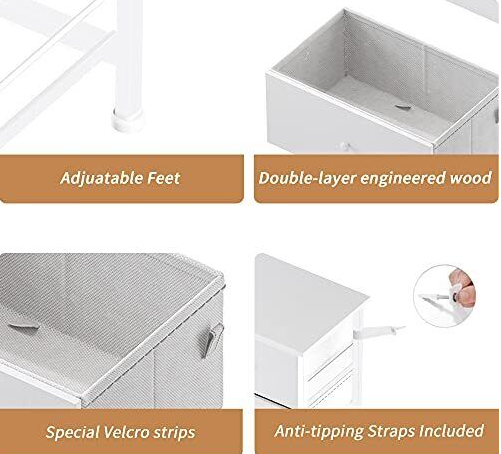 [White Dressers & Chests of Drawers]: Features 6 removable storage drawers made of high-quality non-woven fabrics, wooden front , Wooden handle is not only convenient but also beautiful,no matter kids or adult. Overall dimension: 31.5''*11.8''*28.7''.Drawer dimension: 14.6’’*11.8’’*7.9’’. [Wooden Top and Front ]: This white cloest dresser drawer organizers has water-resistant wood top and particleboard drawer front,offer stable support and ensure years of use,convenient to clean. [Strong and Sturdy System] : High quality steel frame,each drawer has a special Velcro strips to keep the drawers always at their slots,super easy to slide in and out but will not bend or fall down. anti-tipping straps ensure the safety of your energetic kids. [Easy Assembly and Move]: Easy to assemble with hardware included in half an hour,4 adjustable feet protect your floor from scratches. It's lightweight so you could move to any room you want to be tidier easily. [Mutifuction Fabric Dresser]: Smaller dimension with larger capacity fits everywhere in your house for closets, bedrooms, nurseries, playrooms, entrance passages,office, nightstand etc. 100% Satisfaction customer service before and after purchase. |