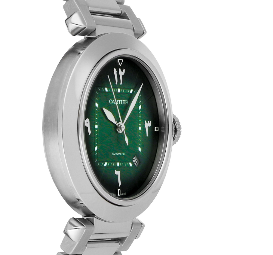 Pre-Owned Cartier Pasha (WSPA0022) self - winding automatic watch, features a 41mm stainless steel case surrounding a green "arabic" dial on a stainless steel bracelet with folding buckle. Functions include hours, minutes, seconds and date. This watch comes complete with the original box and papers. Time remaining on the factory warranty!