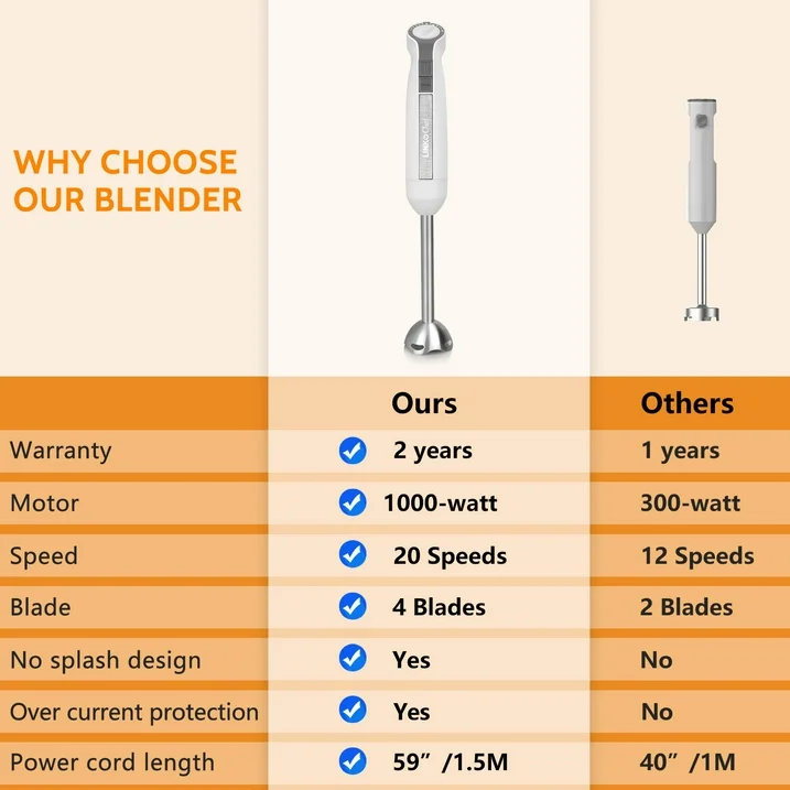 Upgraded 5-In-1 New hand blender customization and ergonomic handle including immersion blender, 500 ml chopper, 600 ml beaker, milk frother, blade shape chopper blade, and egg whisk. A variety of attachments can not only meet your needs for the variety of foods you make but also improve your cooking skills.