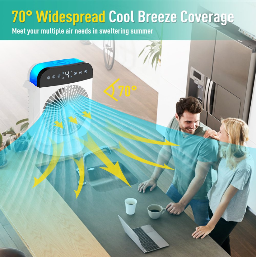 • ❄【Customize Your Breeze with 4 Speeds】The evaporative air cooler fan is designed with 4 wind speeds (Low/Medium/High/Strong).  Wind speed greater than 5m/S, wind distance greater than 4m.  Wind coverage up to 200 sq ft. 90° up and down adjustable air outlet allows blowing the air around you, helping cool you off quickly, which is a good helper to keep cool.