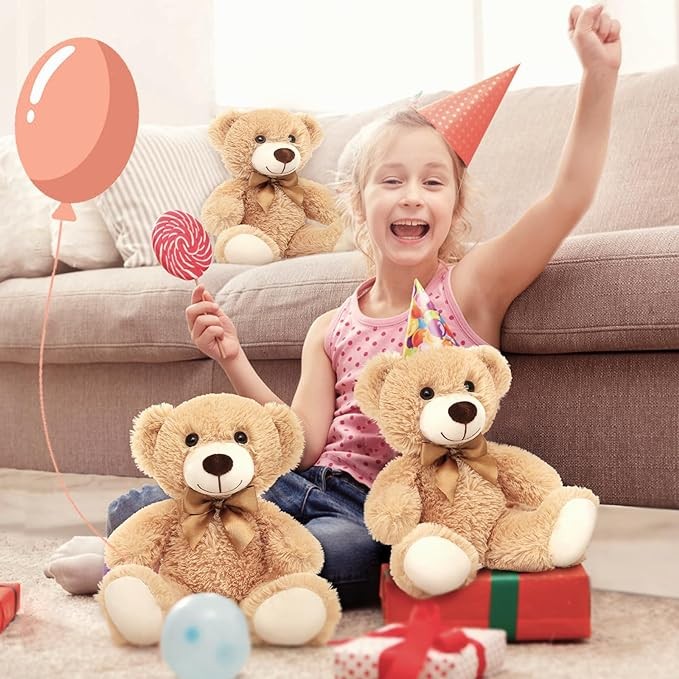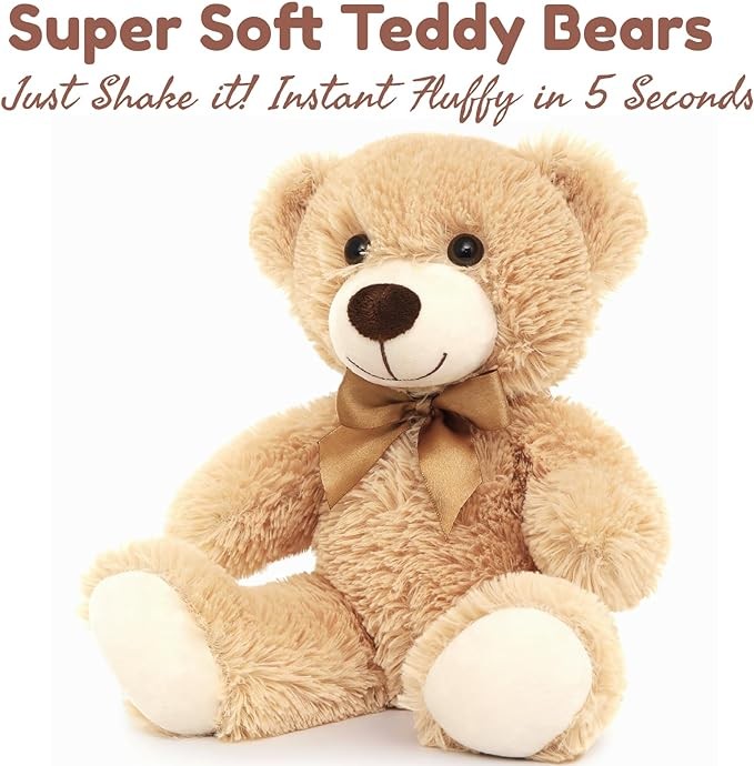 • ?【Softest Playmates】Super soft teddy bear plushies meets CPSC standards and is certified by CPSIA. Our stuffed bears will instantly be fluffy after unpacking. They are skin-friendly and colorproof, the eyeballs are well stitched in the plush so that children will never get access to it or get a chance to swallow it. Especially safe playmates for kids, these lovely brown teddy bear plush toys will allow kids to have fun whether indoors or outdoors without any safety concerns.