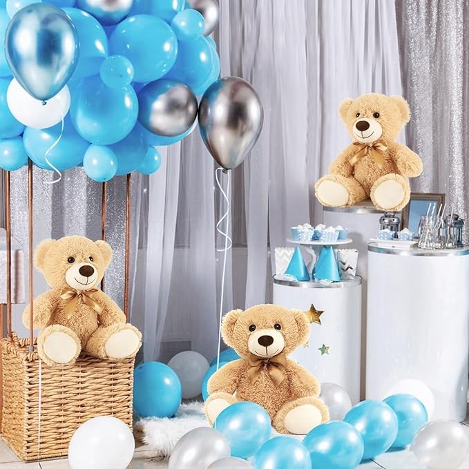 • ?【Excellent Party Decor】Being surrounded by 12 small teddy bears is the happiest thing ever! Eye-catching teddy bears are ideal for decorating any location on any occasion. Our teddy bear stuffed animals bulk is the perfect choice for baby shower centerpieces, for example, a teddy bear-themed party------We Can Bearly Wait! Definitely impresses anyone who joins the party or celebrations. Let's decorate your baby's gender reveals, wedding parties......everywhere need teddy bears!