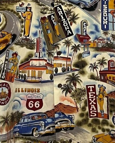 This new with original tag PACIFIC LEGEND  Route 66 Hawaiian Shirt is constructed of a cotton print of all of the Route 66 travel destinations accompanied by pin-up girls and cars!  Very colorful and graphic!  In excellent condition - new with tags.  Does have one spot on the front that might be a bit of color bleed - or it might be in the print.  Just thought i'd mention.  It is at the bottom left off the the "historic 66" sign.  Coconut buttons, single pocket, straight bottom.