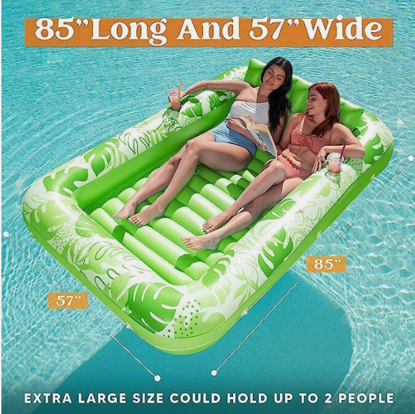 INCLUDES. Packaged includes one 85” x 57” extra large inflatable suntan pool float featured with Inflatable base for extra comfort, two 3”drink holders, one removable headrest, wrap around rope