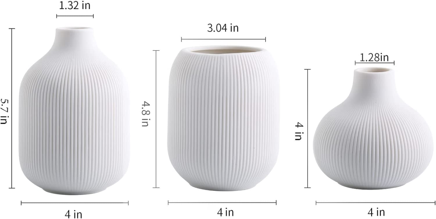 White Ceramic Vase Set of 3,Small Ribbed Vases for Rustic Home Decor,Modern Mini