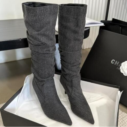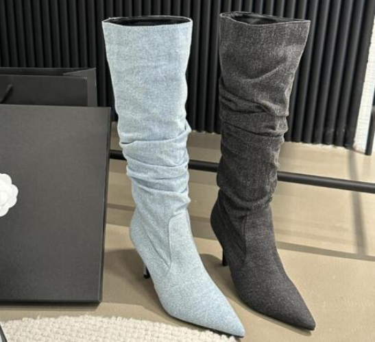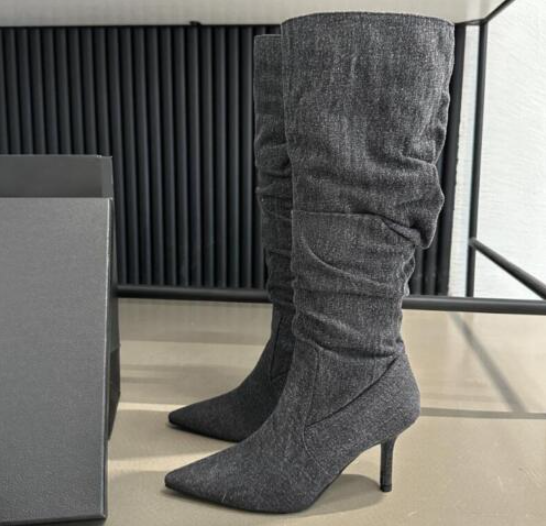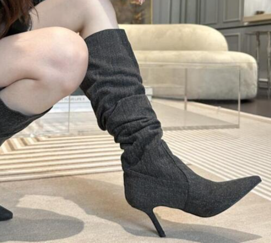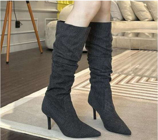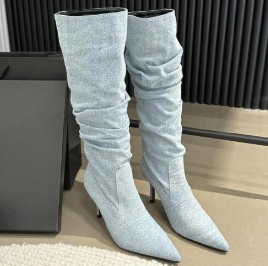 Womens Fashion Pointy Toe Slouchy Denim Knee Boots Sexy Kitten Mid Heels Shoes